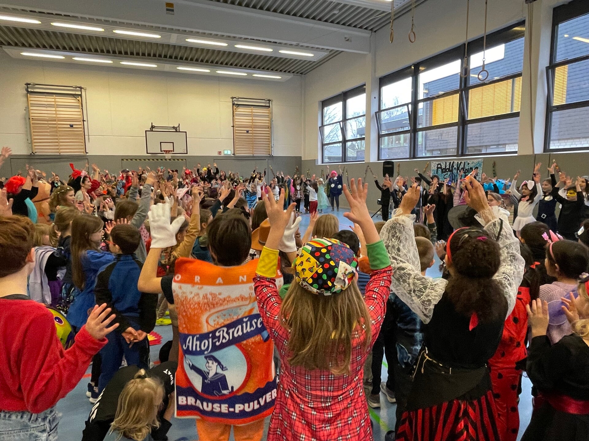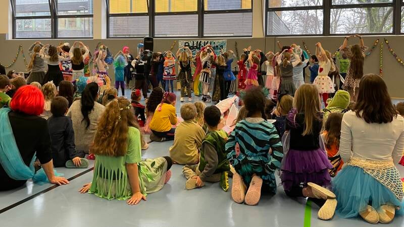 Anschließend führten Leni und Marius durch das bunte Programm. Mit einem dreifachen Alaaf startete die Feier, bevor gemeinsam gesungen, getanzt und gelacht wurde. Viele Klassen präsentierten Lieder, Tänze und kleine Aufführungen. Für besonders gelungene Beiträge gab es immer wieder eine laute „Rakete“ mit Klatschen, Trommeln und Jubeln.